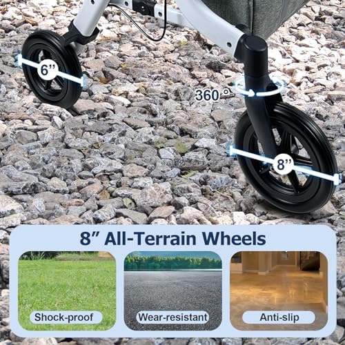 All-Terrain Wheels – Smooth Movement on Various Surfaces. The LANGYI rollator walker is equipped with all-terrain wheels, featuring shock absorption, wear resistance, and durability. The 8-inch front wheels are 360° rotatable, providing excellent maneuverability, making movement easier. With the Foot Lift design, it easily goes up curbs. Perfect for traversing gravel, grass, dirt, and sidewalks with ease.