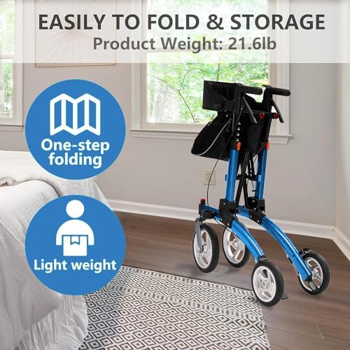 Rollator Walkers for Seniors, Ultra Folding Rollator Walker with Seat 10″ Front TPU Soft Wheels, Medical Rollator Walker with Comfort Handles and Foam Padded Backrest & Durable Brakes (Blue)