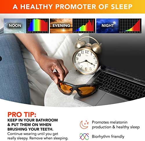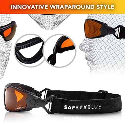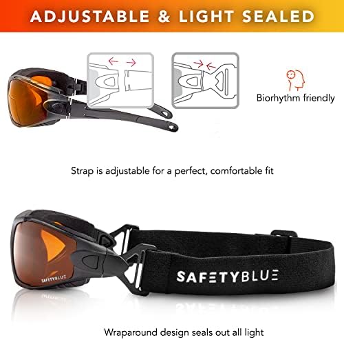SafetyBlue™ Sleep Savior Deluxe Amber Lens Glasses – Block Blue & Green Light, Boost Melatonin, Enhance Sleep Quality, Reduce Eye Strain, Interchangeable Strap, Padded for Ultimate Comfort