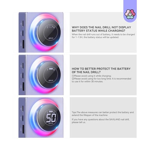 【High Quality & Reliable Use】The 50000 RPM nail drill is built to withstand heavy usage, with a durable construction. It features a long-lasting 6000mAh battery for extended use and a beautiful purple color that resists fading. The functional lighting system and rust-resistant 13 professional drill bits add to its versatility. With its sturdy build and quality materials, this nail drill is designed to handle the demands of professional nail care for years.