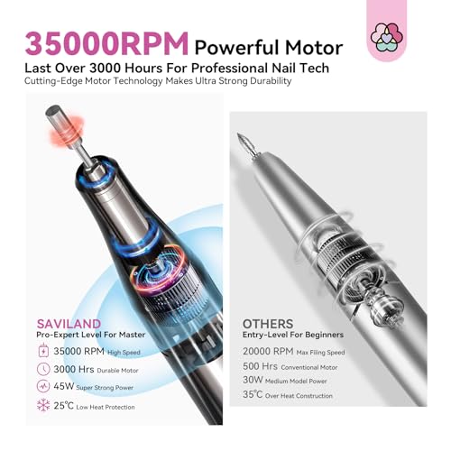 【Durable & 3000+ Hour Long Lifespan】The durable nail drill boasts 3000+ hour lifespan, ensuring reliable performance for countless manicures. With a powerful 35000 RPM motor, 45W strong power, and 25℃ low heat protection, it’s the perfect companion for professional nail care routines.
