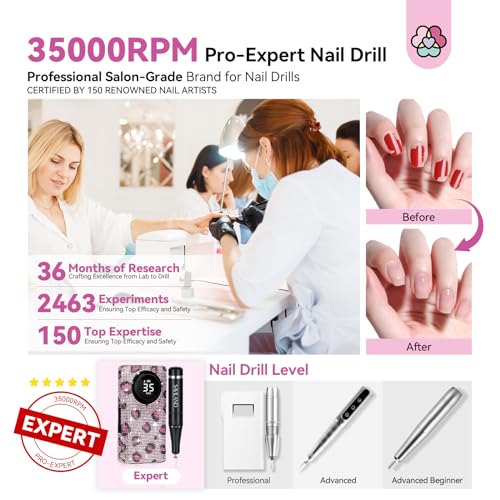 【35000 RPM Pro-Expert Nail Drill】Designed for high-class nail techs, this high-tech drill features innovative Trench MOSFET System for fast acrylic nail removal in 3 mins. Low vibration, low noise, low heat. With 3000+ hour lifespan, 10-hour rechargeable battery, and super-light handpiece, it ensures durability, reliability, and comfort.
