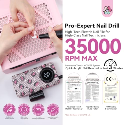 SAVILAND Professional Nail Drill for Nails Tech: Charming Pink Leopard Print 35000RPM Electric Acrylic Nail Drill Kit with 13 Drill Bits Rechargeable E-File Machine Expert Manicure Pedicure Salon Use