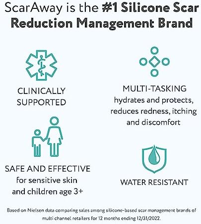 ScarAway Clear silicone scar sheets hydrate and protect while reducing redness, itching and discomfort associated with hypertrophic and keloid scars. This scar treatment helps to improve the texture and appearance of scars resulting from injury, burns, surgeries, cosmetic procedures and more. Clear silicone scar sheets work on newly healed wounds to prevent scars and soften the look and feel of older scars to become closer to your skin’s natural texture and color. ScarAway medical-grade silicone mimics the natural barrier function of healthy skin and is clinically supported to make scars flatter, softer and less visible. Silicone is the number one dermatologist and plastic surgeon recommended scar reduction treatment ingredient (of U.S. Physicians surveyed by an independent market research firm). lightweight and convenient, ScarAway Clear silicone scar sheets are self-adhesive, easy to apply, and water resistant. Each application lasts up to 10 days for discreet continuous coverage. Safe and effective scar prevention and treatment for children over the age of 3 or people with sensitive skin. A softening of the Scar may occur in just days, with improvement in appearance and texture in as little as 4-8 weeks. Individual results will vary.