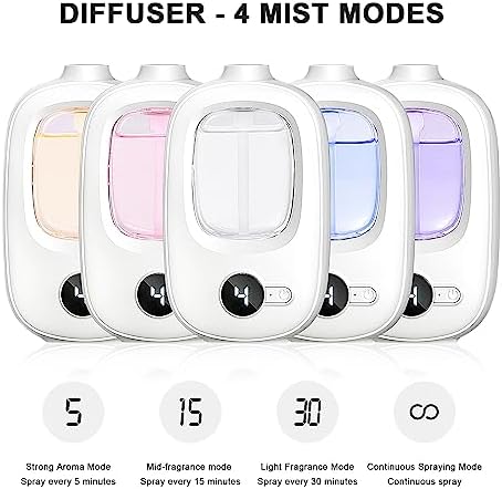 4 MODES / DIGITAL DISPLAY -Select the mode according to needs, freely adjust the aroma concentration. â‘ Strong Aroma Mode: spray every 5 minutes (Can be used for 5-7 days);â‘¡ Mid-fragrance mode: spray every 15 minutes (Can be used for 10-15 days); â‘¢Light Fragrance Mode:spray once every 30 minutes (Can be used for 20-30 days); â‘£Continuous Spraying Mode