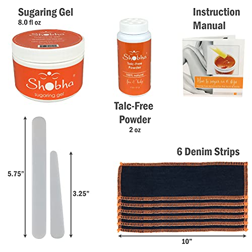 This Shobha Sugaring Hair Removal Kit Includes: 1 Shobha Sugaring Gel 8.0 fl oz 1 Shobha Talc-Free Powder 2.0 oz 6 Shobha Muslin Strips (Reusable) 1 Shobha Sugaring Instruction Booklet 2 Shobha Spatulas (Reusable)