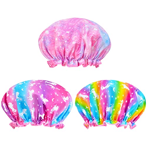 Shower Cap for Kids, 3 Pcs Kids Shower Caps for Girls, Cute Rainbow Hair Cap Wide Elastic Band, Plastic Reusable Waterproof Toddler Shower Cap, Large Bath Cap for Kids Girls Women (Unicorn)