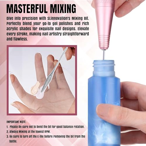 EASY & SAFE OPERATION: Using the SLinnovation Mixing Bit is a breeze. Simply insert it into any standard E-File Hand Piece, set the RPM to the lowest speed, and mix for 10-15 seconds. For optimal safety, always remember to stop the E-file before removing the bit from your nail polish or paint bottle. The accompanying nail polish holder ensures that your nail products are kept securely in place during the mixing process, minimizing spills and messes.