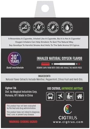 Introducing Cigtrus Smokeless-Inhalers, the revolutionary solution for those seeking a healthier lifestyle. Crafted as a reliable tool to transition away from traditional habits, our inhalers offer comfort and familiarity without the drawbacks. Join the wave of positive change with Cigtrus, where healthier choices align with your well-being goals. Finding it tough to quit smoking? You’re not alone. But with Cigtrus Oxygen Inhalers, you have a natural, safe alternative. Made from plant-based oils with no nicotine or additives, they reduce cravings while promoting decompression. Convenient and non-electric, these inhalers are ready whenever cravings strike. Plus, they emit no smoke or vapor, making them perfect for any setting. Choose from our four refreshing flavors and combine them with other cessation aids. TSA-compliant and travel-friendly, add Cigtrus to your cart today and break free from smoking habits with ease! Experience the freedom to puff on in peace, whether at home, work, or on the go. With Cigtrus, embrace a journey towards wellness without sacrificing convenience or satisfaction.