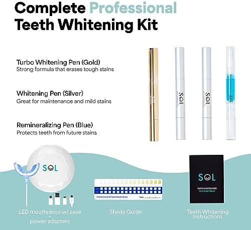 The Sol Professional Teeth Whitening Kit Includes: (1) Turbo Whitening Pen (2) Teeth Whitening Pen (1) Remineralizing Pen (1) LED Mouthpiece (1) Mouthpiece Case (1) Shade Guide. Discover the power of our dental-grade formula that provides real results. Crafted with a blend of advanced whitening pens enriched with carbamide peroxide, this kit effectively erases stubborn stains and delivers a luminous, confident smile.