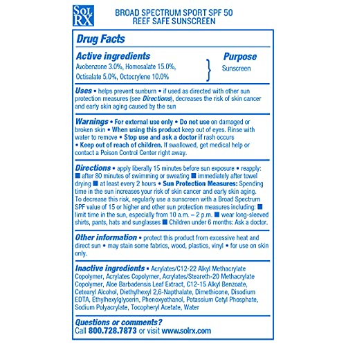 SolRX SPORT SPF 50 Sunscreen, Oxybenzone Free, Broad Spectrum UVA/UVB, Fragrance Free, Reef Friendly