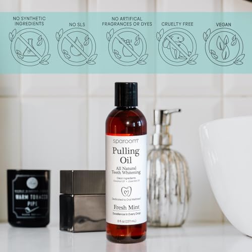 SPAROOM PULLING OIL: an ayurvedic blend of fractionated coconut oil; seven pure, natural, and ethically sourced essential oils. The seven different globally farmed essential oils are peppermint, spearmint, cardamom, fennel, clove, oregano, and tea tree oils. This authentic blend of oils with vitamins is a natural teeth whitener oral rinse that helps freshen your breath and supports healthy gums.