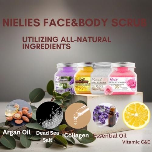 “Nielies Lavender Body Scrubs offer a luxurious experience infused with 24K Gold, Dead Sea Salt, Argan Oil & Vitamin C. This exfoliating body scrub caters to both body and face, providing a comprehensive skincare routine for women. Ideal as a 2023 Christmas gift, it embodies the essence of spa indulgence and relaxation. Elevate your self-care with this exquisite body exfoliator, making it a perfect addition to bath products and beauty stocking stuffers. Enjoy the rejuvenating benefits of this scrub, perfectly suited for a spa day, ensuring women in their 30s feel pampered and cherished. It’s a thoughtful gift for wives seeking something special, even for those who seemingly have everything. The blend of ingredients offers more than just a sugar scrub for body; it’s a shower scrub that comes with elegance, sophistication, and care in every container. Enhance your shower experience with these premium shower accessories designed specifically for women, making it one of the best body skin care products available. Perfectly curated for women, this scrub set serves as a delightful addition to favorite things gift ideas and stands out as one of the best stocking stuffers for women, encompassing the essence of beauty, luxury, and self-care in every delightful use.”