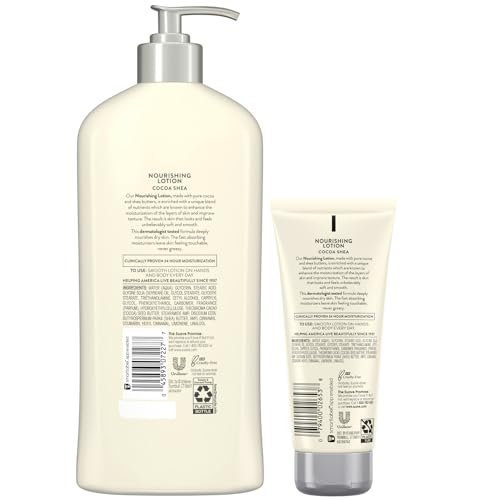COCOA SHEA BUTTER LOTION SET: Relief from dry skin is only a pump away with the large 18-ounce bottle of Nourishing Cocoa Shea Lotion; this skin care bundle includes one 3-ounce tube for moisturizing on the go.