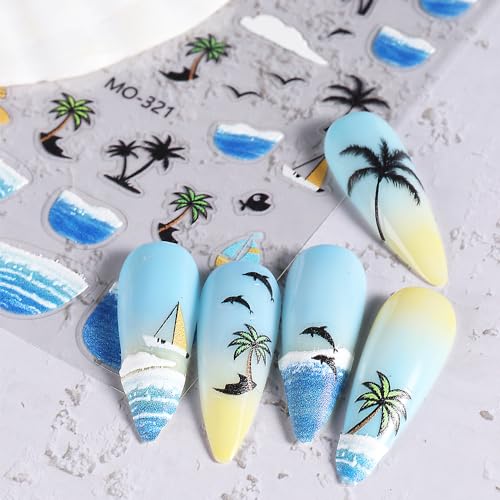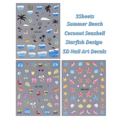 Summer Coconut Tree Nail Art Stickers Decals 5D Acrylic Engraved Nail Stickers 3PCS Beach Ocean Shell Starfish Cool Sea Palm Summer Nails Design Decals Manicure Accessories for Nail Art Decorations