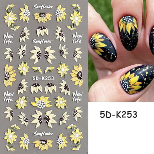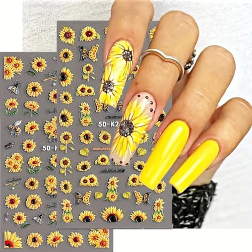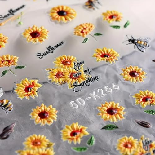 Sunflower Nail Stickers for Nail Art – 5D Embossed Sunflower Nail Art Decals Flower Bee 3D Self Adhesive Nail Art Supplies Flower Decals for Acrylic Nails Summer DIY Manicure Nail Art Decorations