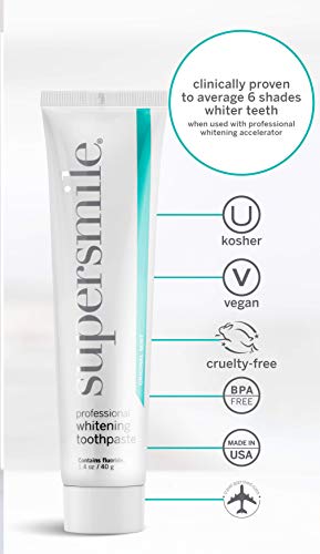 The Supersmile Professional Teeth Whitening Toothpaste removes stains with powerful whitening agents such as carbamide peroxide. Clinically proven to whiten teeth 6 shades on average and restores bonded teeth, veneers, caps, and dentures to their original shade.