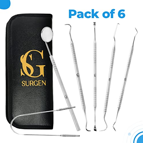 SURGEN Dental Hygiene Tool Kit – Stainless Steel Plaque Remover for Teeth, Oral Care Cleaning Tools Set with Tooth Scraper, Tartar Remover, Dental Pick, Gum Floss – Includes Travel Case (6 Pack)