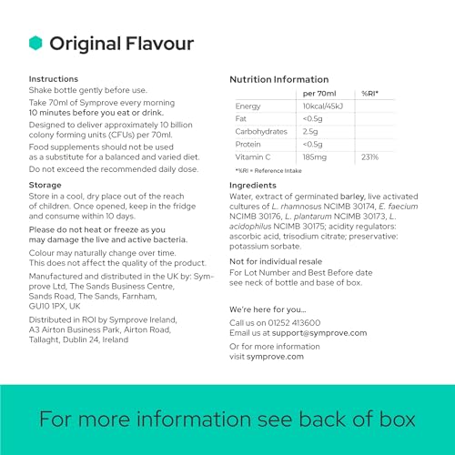 Showing signs of an unbalanced good? Symprove delivers live, active multi-strains of ?friendly? bacteria to the gut – just where they are needed. It’s totally different to any other multi-strain supplement because of its Unique Delivery System (UDS?). This special delivery system protects the beneficial? bacteria from the gastric juices in the digestive tract, where they quickly reach targeted areas of the gut and colonise. Delivered as a water-based barley drink, Symprove Original is non-dairy and gluten-free. It contains 10 billion live colony forming units (CFUs) per 50 ml can. For first-time users of Symprove, some people dislike the natural flavour of barley. If this concerns you, please order Mango & Passion Fruit. Healthcare practitioners recommend first-time users drink a Course of Symprove (3 months), to effectively restore and fully reset balance in the gut. Many people go on to take a maintenance dose (half dose) as part of their daily diet. Dairy drinking yoghurts (found in supermarkets), trigger digestion in the stomach which produces a lot of acid. This starts to ?attack? the beneficial bacteria as part of the digestive process and they become weakened or are destroyed. Freeze-dried bacteria supplements such as capsules or powders have different challenges. These live bacteria are subject to extremely cold temperatures (around -80?C), to turn them into capsules or powder, and many die in the process. Those that survive need to rehydrate before the bacteria are revived and can start work. This takes several hours whilst they travel down your digestive tract. Once the surviving freeze-dried bacteria become active, many of them will have passed beyond the areas of the gut where they are needed, and pass out in your stools. Store Symprove at ambient temperature. Once open, pop in the fridge.