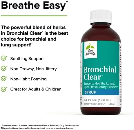 Terry Naturally Bronchial Clear – 3.4 fl oz Syrup, Pack of 2 – Supports Healthy Lung & Upper Respiratory Function – Non-Drowsy, Non-Jittery Formula – Non-GMO, Vegan, Gluten Free – 40 Total Servings