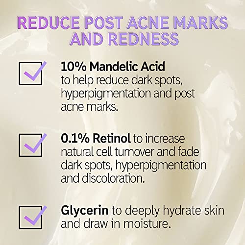Powerful Ingredients, Real Results. 10% Mandelic Acid (an AHA) reduces dark spots and acne scars. Retinol increases natural cell turnover to fade discoloration. Glycerin deeply hydrates skin and draws in moisture.