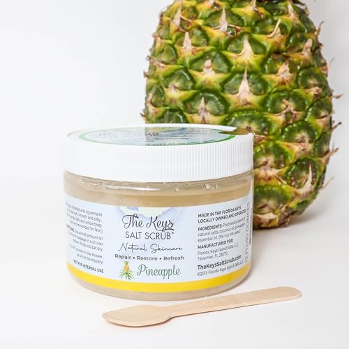 The Keys Salt Scrub, Exfoliating Sea Salt Body Skin Scrub, foot scrub, hand scrub for men, women, bikini exfoliating, Made with Pure Florida Sea Salt Organic Essential, Pineapple (wooden spoon, 12 oz)