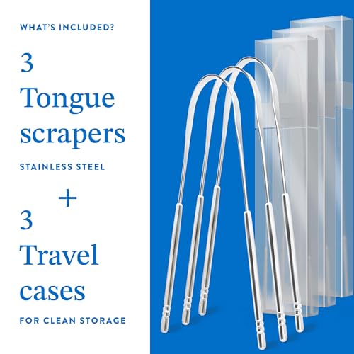 Tongue Scraper for Adults, Stainless Steel Metal Tongue Scraper for Tongue Cleaning and Reducing Bad Breath, Tong Style Tongue Scraper for Oral Care with Case, Reusable (3 Pack)
