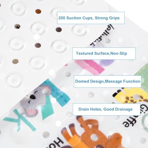 SAFE AND DURABLE PVC MATERIAL: Non-slip bathtub mat is made of safe and eco-friendly PVC material, BPA free. High quality PVC shower bath mat surfaces are soft to the touch, durable and fade resistant to ensure your child’s safety and comfort in the bath.