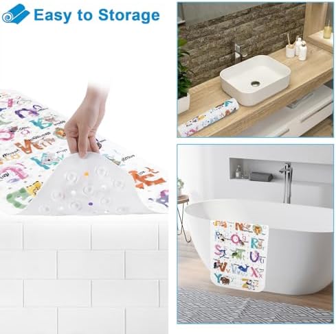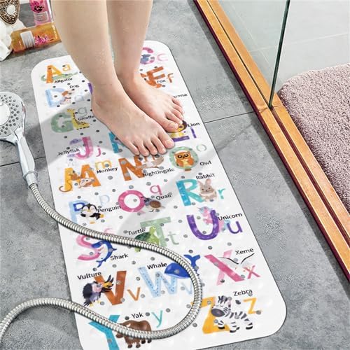 Topotdor Baby Bath Mat for Tub for Kids, 40 X 16 Inch Extra Long Toddler Bathtub Mat Non Slip, Machine Washable Bathroom Shower Floor Mat with Suction Cups & Drain Holes, Alphabet Animal