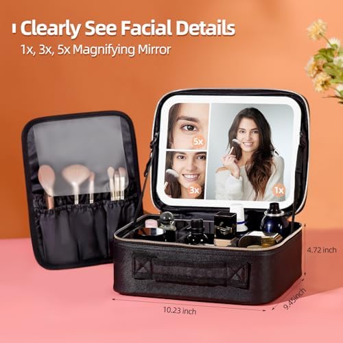 Travel Makeup Bag with LED Lighted Make up Case with 3X 5X Magnification Mirror Cosmetic Makeup Box Organizer Vanity Case for Women Beauty Tools Accessories Case Rechargeable