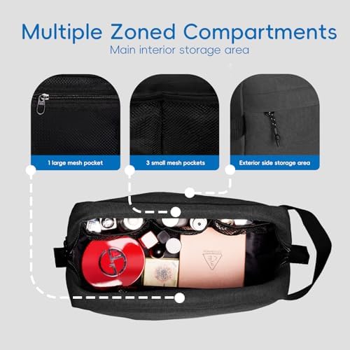 【Smart Size & Ultra Lightweight】 — Our toiletry bag dimension is 9.5(L)x 4.3(W)x 5.5(H) inch. Main compartment is roomy enough to fit a facial cleanser, electric shaver, travel shampoo, and other toiletries. It has 1 long mesh zipper pocket inside to store all of your little toiletries without getting disorganized. And 1 front zipper pocket that provides extra storage with ease