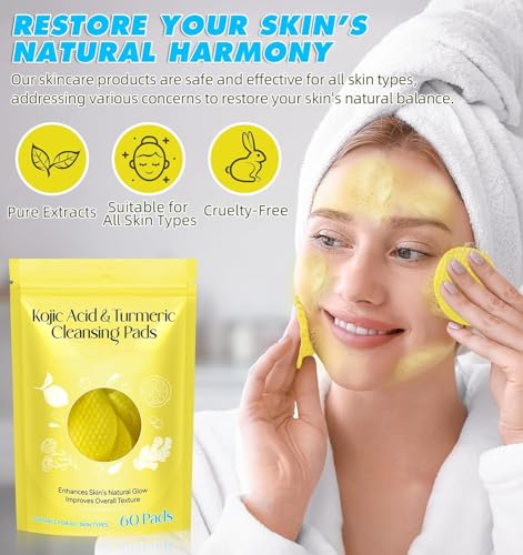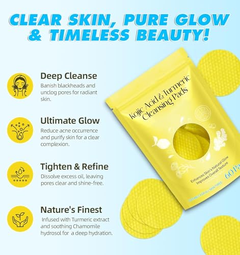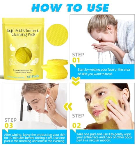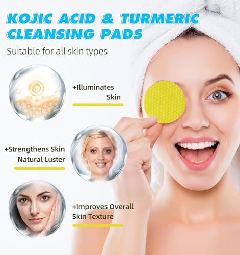 Turmeric Cleansing Pads for Dark Spots, Turmeric Kojic Acid Cleansing Pads Infused Foaming Exfoliating and Cleansing Pads,Remove Excess Keratin (60 Pads)