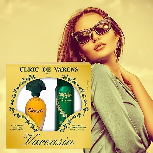 Ulric De Varens VARENSIA – Eau De Parfum for Women 2pcs Set- Earthy, Fruity, Floral Scent – Notes of Lotus Flower, Clove Raspberry, & Vanilla- Fruity & Floral- 1.7 Fl Oz + 4 Fl Oz Deodorant Spray