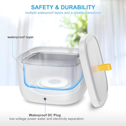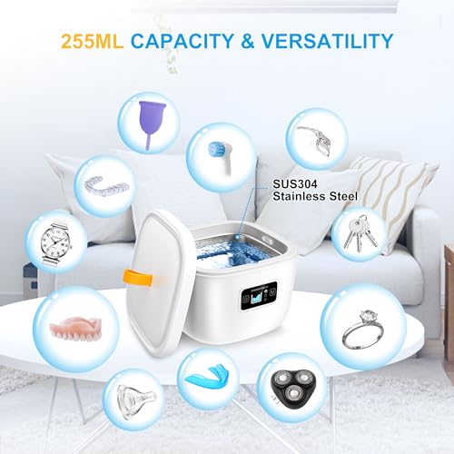 【PORTABLE & DURABLE】 Designed with elegance and user-friendly in mind, the compact and lightweight jewelry cleaner ultrasonic machine is easily portable. With a spacious 255mL cleaning tank, it can clean most dental appliances, jewelry, and more. Multiple waterproof layers and a reliable transducer ensure its longevity.