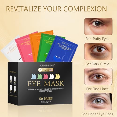 Variety Efficacy Eye Patches:CHMI Under Eye Patches (50 Pairs) includes 24k Gold eye masks (10 pairs)-can deeply nourish and replenish the skin around the eyes.Red Pomegranate eye masks (10 pairs)-can bring a soft, moisturizing, and hydrating effect to the eye area. Seaweed eye masks (10 pairs)-can improve pigmentation issues in the eye area. Hyaluronic Acid eye patches (10 pairs)-can lock in moisture around the eyes and prevent dryness. and Pearl eye patches (10 pairs)-can improve concerns like sagging and fine lines in the eye area.