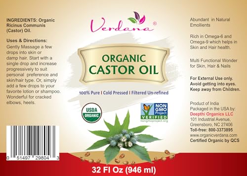 Verdana Organic Castor Oil – 32 Fl Oz Bulk size – Cold Pressed, Unrefined, Hexane Free – For Face, Hair, Pack Wrap