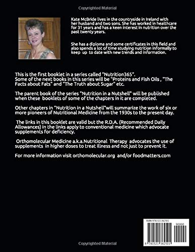 This short and simple book explains why we need to supplement our diet to maintain health and wellness. It also outlines the small number of daily supplements to take based on a consensus of medical opinion over a long period of time. There is a summary of all vitamins and minerals, their functions in the body and the food sources you can get them from as well as the symptoms of deficiency of these nutrients. No fluff, no hype, no opinions here. Just the facts and information you need to know to maintain your most important asset-your health. This information is provided in the context of nutritional therapy which is part of the wider field of orthomolecular medicine. The author has studied this subject matter for twenty years, has a diploma and other certificates in nutrition and keeps up with new trends in research and practice in this field. There are a lot of links to accurate online sources of information about the benefits of taking regular vitamin and mineral supplements but it is necessary to say that the recommended daily allowance dosages of conventional medicine are different from the protocol in orthomolecular medicine, also known as nutrition therapy. This book is the first of a series called “Nutrition365” and is a chapter from the “parent” book “Nutrition in a Nutshell” which will be published later. In the meantime, there will be other short books in this series called “Protein & Fish Oils”, “The Facts about Fats” and “The Truth about Sugar” and maybe more. They will all be good value for money, especially the Kindle ones because of the many links to further information in them. This book is a handy reference guide in any home for individuals or families who are interested in maintaining their health. It will also be interesting for those in conventional medical practice if they are curious about the orthomolecular field which is not in conflict but in tandem with their own practice. It is worth mentioning here that the Kindle version is better value at its price and in context of its direct access to website links than the paperback. However, it is my experience so far with books like this that many people like to keep a paperback book like this in their home, sometimes along with the first aid kit for ease of access and reference to as necessary. Buy this wee book! It is not expensive and it will come in handy 🙂 Kate