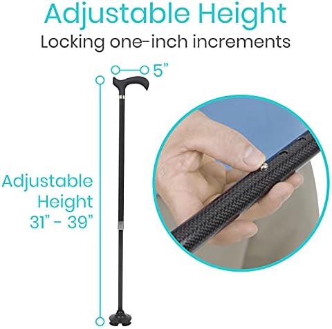 EASY HEIGHT ADJUSTMENTS: Secured with a locking latch, the Vive carbon fiber standing cane is height adjustable from 31” to 39.5” for a comfortable fit for most adults. The cane adjusts with a simple, 1” push-pin system for easy personalization.