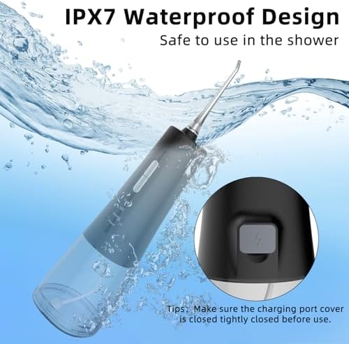 IPX7 Waterproof & 300 ML Water Tank- The water flosser has a charging port slot on the back of the unit, you can cover it while you are in the shower, very waterproof for peace of mind while you are in the shower. There are two ways to open tank: the top of the tank and the bottom of the tank for easy cleaning.