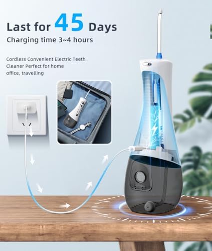 🔋LONG BATTERY LIFE: This oral irrigator cordless lasts up to 45 days on a 4-hour charge. Compact and lightweight, irrigador dental water flosser perfect for use at home and on the go, so you can take it with you wherever you go. 45 days of battery life makes electric water flosser the perfect solution for true portability!