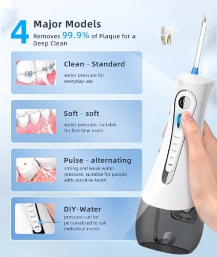 🦷4 Main Modes: Clean – Standard water pressure, deep cleaning between teeth, meets most people’s daily use needs. Soft – Soft water pressure for first time users. Pulse – alternating strong and weak water pressure, can deep clean teeth and massage gums, suitable for people with sensitive teeth.DIY can personalize the water pressure according to their own needs, to achieve one-button quick operation control, suitable for all people. MORE MODE SELECTION : The teeth water flosser has pre-selected mode and memory mode.