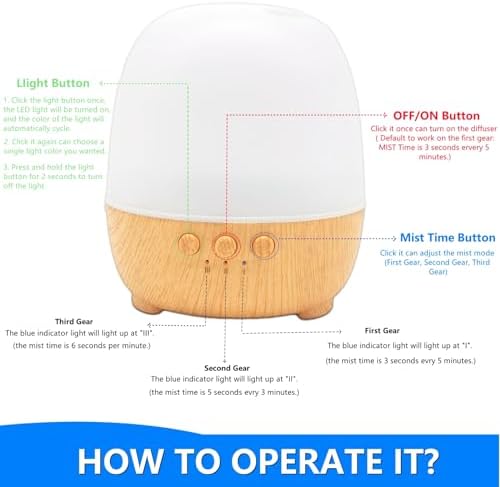 ใ€Smart Cycle Mistใ€‘Our waterless diffuser for essential oils is 3-speed mist, the First gear: working 3 seconds every 5 minutes; the Second gear: working 5 seconds ervery 3 minutes; the Third gear: working 6 seconds every 1 minute; The diffuser device will work regularly non continuous mist which will prevents effectively overpowering fragrances to provid you with a comfortable and enjoyable aromatherapy experience. (Click the right button to control the gear .)