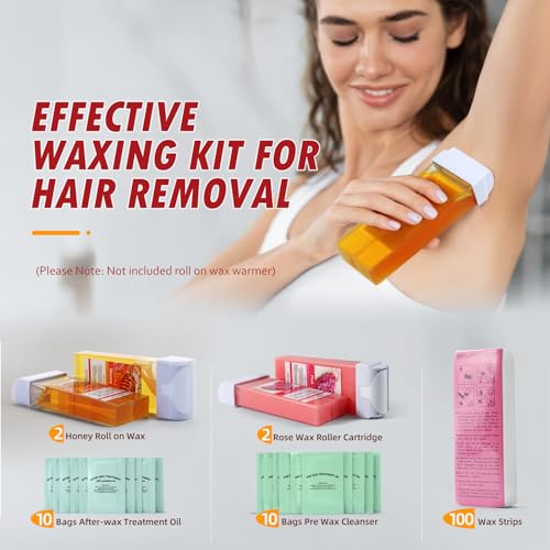 Roll on wax kit: The waxing kit includes 2 honey wax cartridges 2 rose soft wax roller refills 100 depilatory wax papers 20 clean oil, not including roll-on wax warmer. This waxing kit is ideal for both professionals and beginners.