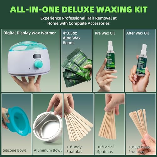 📦【ALL-IN-ONE ALOE WAXING KIT】Experience the ultimate convenience with our comprehensive Home Wax Kit for women and men. This all-inclusive set comes with a state-of-the-art Digital Wax Melt Warmer, 4*3.5Oz Soothing Aloe Hard Wax Beads, 2*60ml Nourishing Aloe Pre/After Wax Oil, Silicone and Aluminum Liner Pot Bowl (you only need to pick one you like to use, not together), 10*body, 10*face, and 10*eyebrow Spatulas Sticks. Everything you need for a flawless waxing session is right at your fingerti
