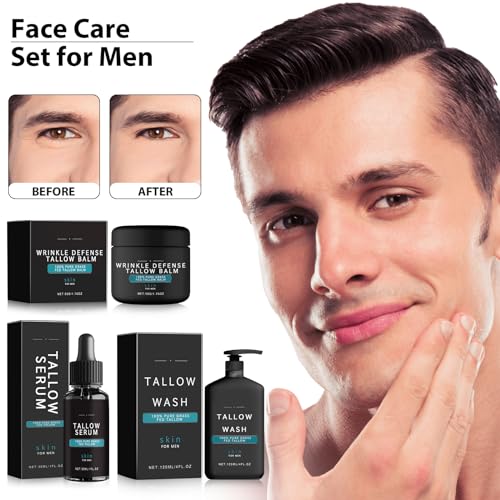 Wrinkle Defense Tallow Balm, 3 In 1 Mans Skincare Kit, Tallow Serum & Face Wash, Facial Skin Care Kit For Men, Tallow Moisturizer For Face, 100% Natural Beef Tallow Balm, Reduce Fine Lines
