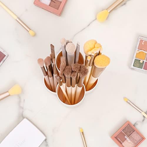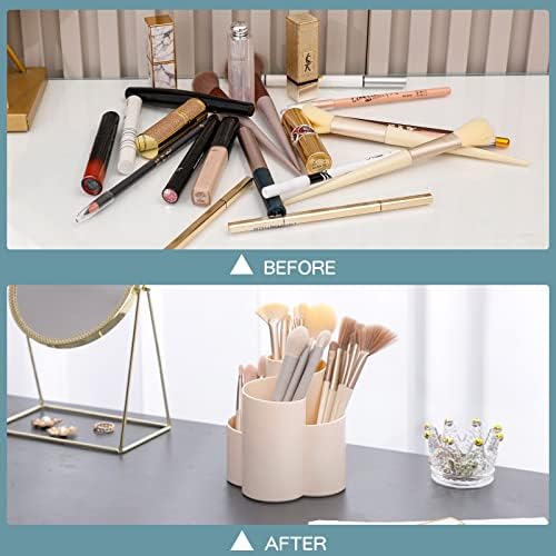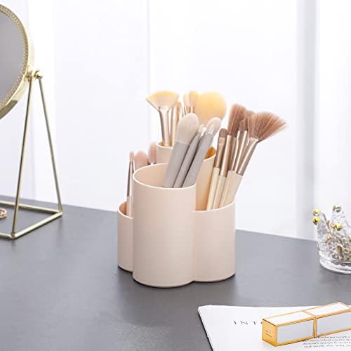【ARTISTIC DESIGN】: Classic beige makeup brush holder for desk is artistic design which is inspired from Mobius Strip, the shape and 4 compartment design is splitting, deforming and raising the height from 2 Mobius Strip, bring the brush cup more practical and artistic.