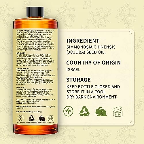 100% Pure & Natural Jojoba Oil: Yoken jojoba oil organic is cold pressed from jojoba seeds of Israel, extra virgin, and unrefined. Single Ingredient Oil, Chemical Free, Alcohol Free, Parabens Free, Hexane Free, and Cruelty-free.