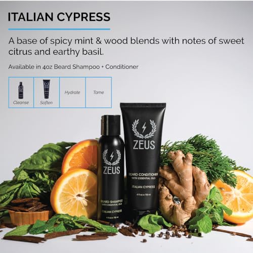 BEST BEARD WASH: Discover our premium beard wash combo set which includes the cleansing ZEUS Italian Cypress Beard Shampoo Wash & our moisturizing ZEUS Italian Cypress Beard Conditioner Wash, both come in convenient 4 oz. bottles.