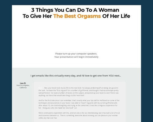 Alex, your book took my sex life to the next level…I’ve always prided myself on being very good in the sack. I’ve been the “first orgasm” for a number of girlfriends, and thought I had my technique pretty well perfected. I’ve read a number of books on the subject, and picked up your book to see if there was anything out there that would take things to the ‘next level’…And for the first time since I can remember, that’s exactly what your tips did for me.Based on some of the techniques and assurances in your book, I was able to “stack” orgasms with my current girlfriend until, after about 10, she started laughing and crying at the same time…It was like a religious experience for her. And guess who she made her new God? Lol.We’ve continued to experiment with this, and not only is the sex mind-blowing, but it has built a lot of trust and closeness between us. There’s something awesome about knowing you can pleasure your woman unlike any man ever has.We’ve made it a game to see how many times I can make her come in a row… this week we hit 42! It just keeps getting better and better…So a BIG thanks man!Keep up the awesome work!